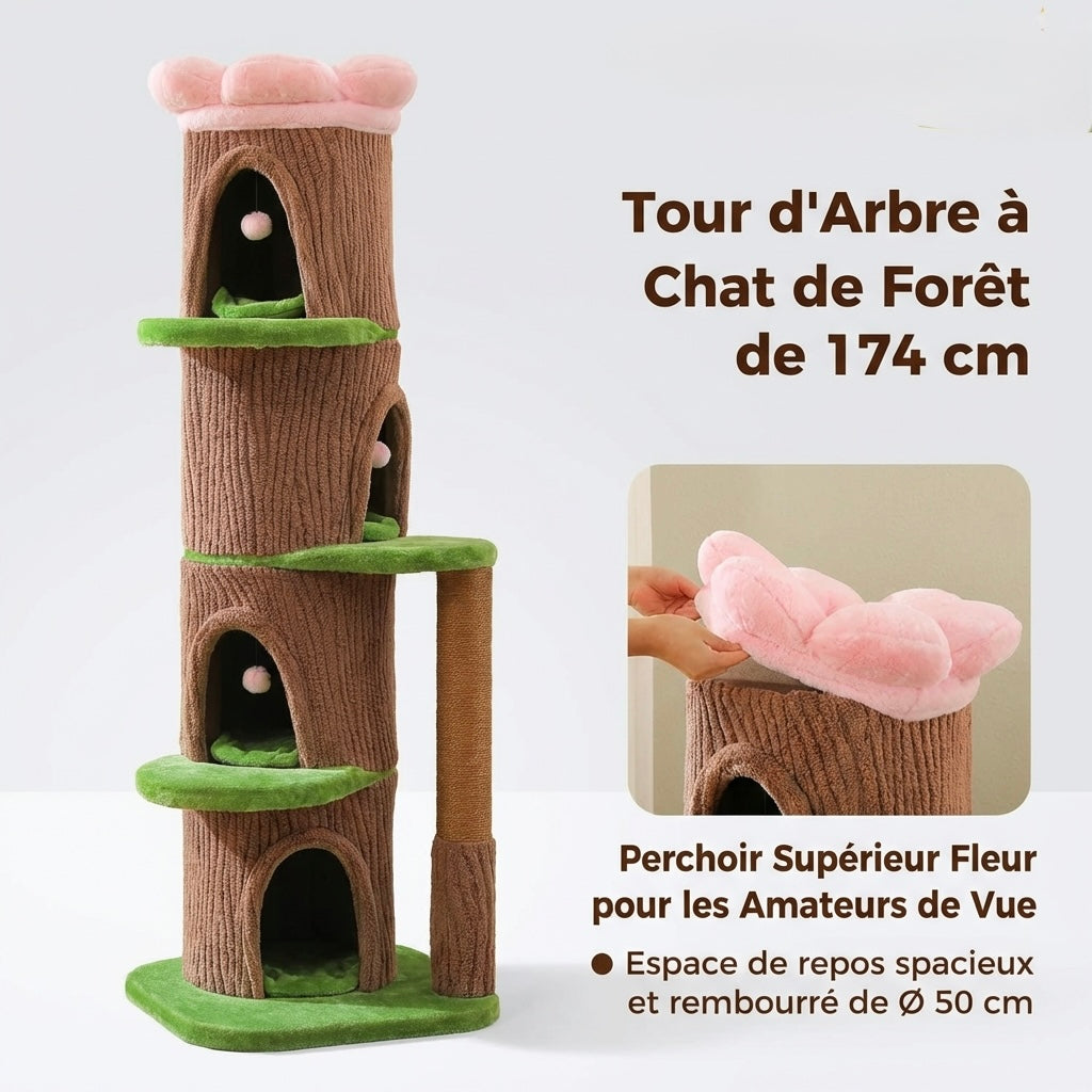 Arbre à chat géant de 174 cm avec design tronc d'arbre réaliste. Équipé de 4 niches spacieuses, poteau griffoir extra-épais de 9,7 cm de diamètre et lit fleur au sommet. Base lestée ultra-stable. Couleur marron.